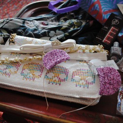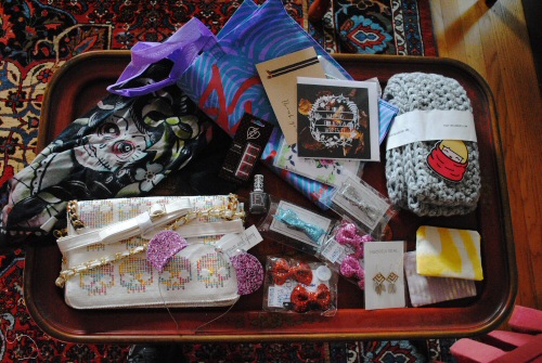It was packed with the coolest stuff. A handbag from Iron Fist, pouches from Basik855, sparkly nail-polish from Lex Cosmetics, jewellery from Moorea Seal, glittery shoe clips from Head Full of Feathers, glitter hair bows by MARGRAVINE x Sewmaryann, greeting cards by Mr. Yen, scarves from The Pink Samurai and glitter ears from Crown and Glory.