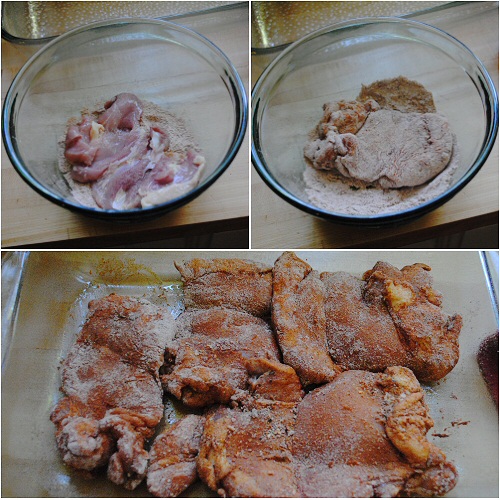 Combine all the powder ingredients in a bowl and mix them up. Wash the chicken, laying them out flat to dry. Keep them flat and absolutely cover them in the mixture. You want this stuff in all the nooks and crannies.
