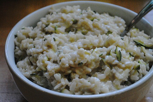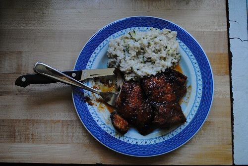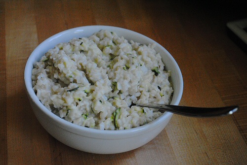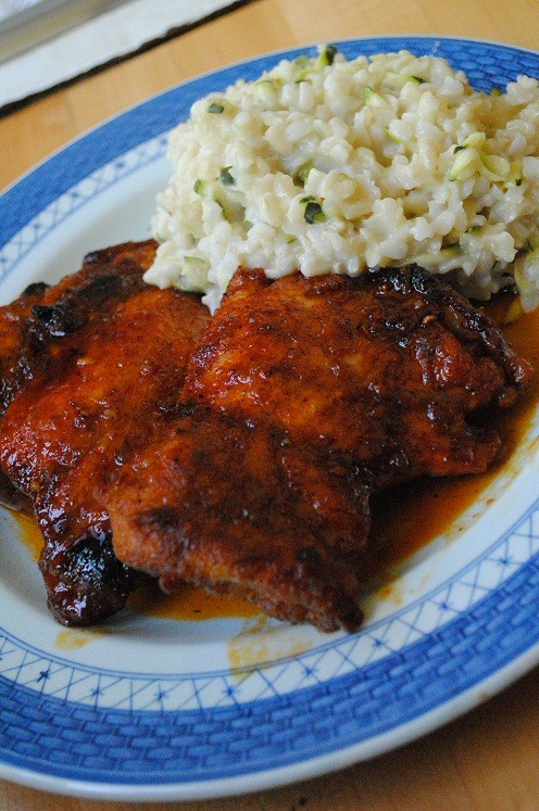 I paired the chicken with another recipe I discovered recently for brown rice here. After cooking the rice completely I added 2 grated zucchini, 1 cup of grated cheese, and a splash of milk. I mixed it up and left the lid on the pot off of the heat so that the zucchini cooked and the cheese melted.